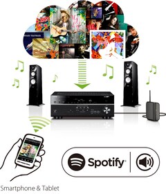 This AV receiver provides a variety of network functions that enable you to access more sources and also enhance operation. You can connect the receiver to your home network or internet to enjoy Internet Radio, Spotify*, Pandora®*, Napster®*, SiriusXM*, Tidal*, Deezer*, Qobuz*, JUKE* or music stored on a NAS and home PC. The AV Controller app (from iTunes® App Store or Google play) lets you control various functions from your iPod®, iPhone®, iPad® or Android™ phones / tablets.