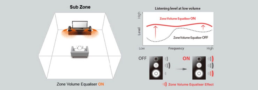 Automatically adjusts bass and treble balance to match the volume on system in other rooms (Zone 2). Enjoy movies and music with a natural sound quality balance even at low volumes.