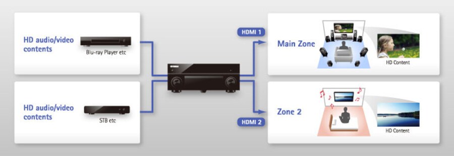 HDMI zone switching offers the ability to individually select and send HD video programmes to two separate zones. Watch a Blu-ray Disc™ movie in the Main Zone while an HD cable TV broadcast plays in another room (Zone 2).