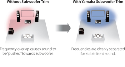 The Subwoofer Trim control enhances the low frequencies by avoiding overlap with the front speaker output. This will result in a cleaner, more focused sound stage while providing a seamless frequency response. When subwoofer frequency overlap occurs in conventional systems, the overall sound is “pushed” toward the subwoofer. Subwoofer Trim takes care of this by separating the low subwoofer frequencies cleanly, thus stabilising the front stage while providing a well-balanced enhanced bass sound.