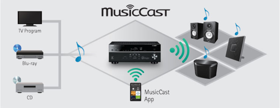 MusicCast employs a high performance wireless network to deliver music and audio enjoyment. It can stream digital music content from your smartphone, PC or NAS to other MusicCast devices in your home. It can also share the music from external devices such as a TV or Blu-ray Disc™ player connected to the RX-A1060. Audio content from Bluetooth®-connected smartphones or tablets can also be streamed to MusicCast devices in multiple rooms.