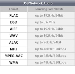 - DSD 2.8 MHz / 5.6 MHz, FLAC / WAV / AIFF 192 kHz / 24-bit, Apple® Lossless 96 kHz / 24-bit playback