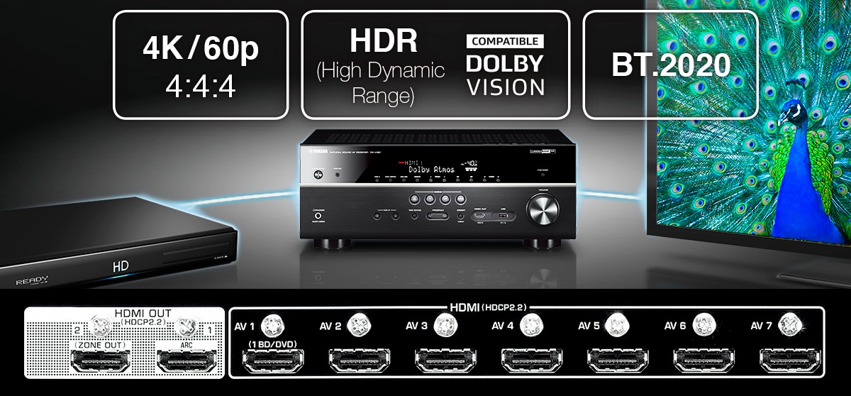 - HDMI® (8 in / 2 out) with 4K Ultra HD full support, HDR Video including Dolby Vision and Hybrid Log-Gamma, and BT.2020