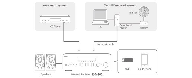 MusicCast employs a high performance wireless network to deliver music and audio enjoyment. It can stream digital music content from your smartphone, PC or NAS to other MusicCast devices in your home. It can also share the music from external devices such as a CD player or TV connected to the R-N402. Audio content from Bluetooth-connected smartphones or tablets can also be streamed to MusicCast devices in multiple rooms.