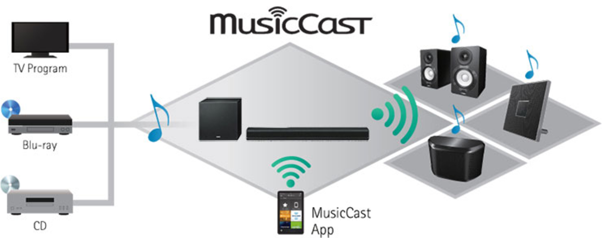 MusicCast employs a high performance wireless network to deliver music and audio enjoyment. It can stream digital music content from your smartphone, PC or NAS to other MusicCast devices in your home. It can also share the music from external devices such as a TV or BD player connected to the YAS-706. Audio content from Bluetooth-connected smartphones or tablets can also be streamed to MusicCast devices in multiple rooms.