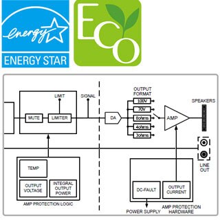 El MA2120 y el PA2120 están certificados por ENERGY STAR*, la norma de eficiencia energética reconocida internacionalmente otorgada a equipos que respetan el medio ambiente. Ambos modelos tienen una función de espera automática que reduce al mínimo el consumo de energía al cambiar automáticamente al modo de espera cuando no se detecta ninguna entrada de audio durante más de 25 minutos. El funcionamiento normal se reanuda tan pronto como se detecta la entrada de audio. Los amplificadores con eficiencia energética de las series MA/PA también están certificados como productos ecológicos de Yamaha.**