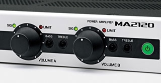 Amplificador clase D conmutable Lo-Z/Hi-Z (Lo-Z: 120W x2 @4Ω, 100W x2 @ 3Ω/8Ω, Hi-Z: 120W x2 o 200W x1, 70V/100V) equipado con entradas de línea 1 estéreo/2 mono; se puede combinar con el amplificador consola MA2120.