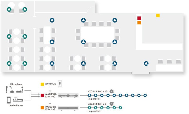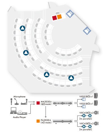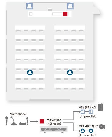 Este sistema es adecuado para su uso en salas de conferencias o salones de actos. Se utiliza un MA2030a en modo de 8 Ω y un PA2030a en modo de 4 Ω accionando un par de altavoces de montaje en superficie VXS5 (8 Ω cada uno) y cuatro altavoces de techo VXC4 (8 Ω cada uno) respectivamente. Se pueden conectar múltiples micrófonos al MA2030a y el nivel global de salida en la sala se puede controlar fácilmente mediante el mando de volumen del panel frontal.