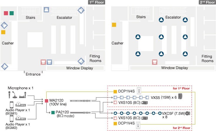 Esta figura muestra un sistema en una tienda de ropa con dos pisos, donde se requiere música diferente y con distinto nivel de volumen en cada piso. El MA2120 está configurado para enviar señal a líneas de 100 voltios, accionando un total de seis altavoces de montaje en superficie VXS5 para el primer piso y ocho altavoces de techo VXC5F para el segundo piso. El amplificador PA2120 adicional acciona un subwoofer VXS10S para cada piso, dotando a la música de mejores graves. Los paneles controladores DCP1V4S permiten manejar el volumen de cada piso, así como la activación/desactivación del micro para hacer anuncios en la tienda.