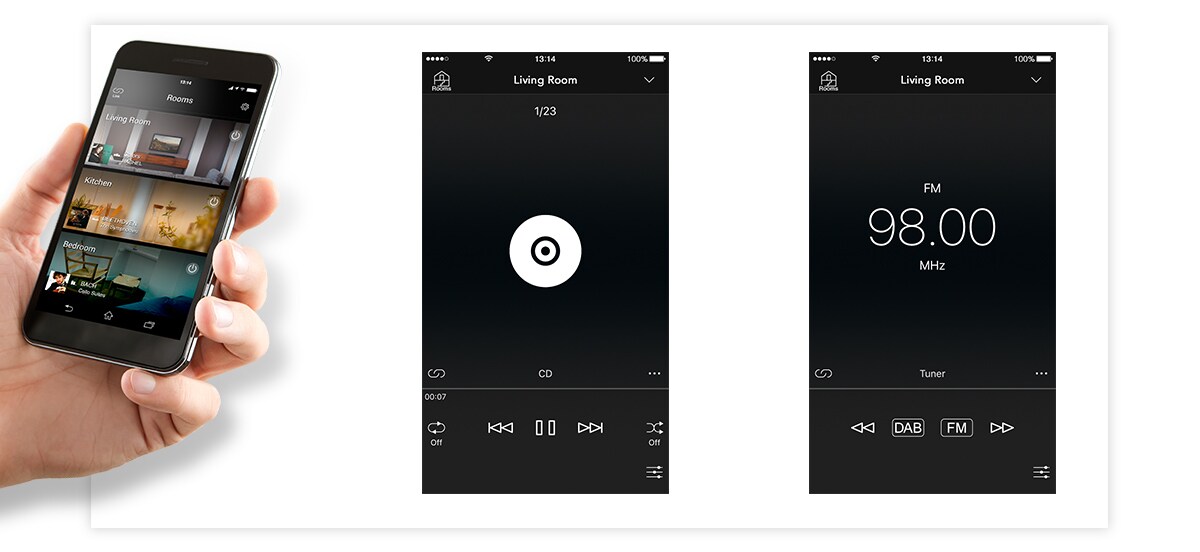 The MusicCast App makes it easy to select and play songs from CDs and USB devices, as well as to select radio stations (FM and DAB). In addition, by using the MusicCast Link function, you can send those sources to other MusicCast compatible devices for enjoying them in other rooms.