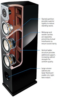 The design of the cabinet is of course extremely important if the aim is to create a speaker with superior reproduction capabilities. The goal was to reduce standing waves to ensure highest accuracy, as well as to provide a full, three-dimensional sound with an awesome feeling of depth. The solution was to design a cabinet with non-parallel surfaces, having the woofer and midrange sections divided by a slanted partition, and strengthening the entire enclosure with vertical ladder bracing. Another important point is the three-way mitered construction of the cabinet joints, achieved thanks to Yamaha’s excellence in woodworking. This technique ensures extremely tight joints so the entire cabinet behaves as a single unit, providing tight, powerful and accurate bass reproduction.