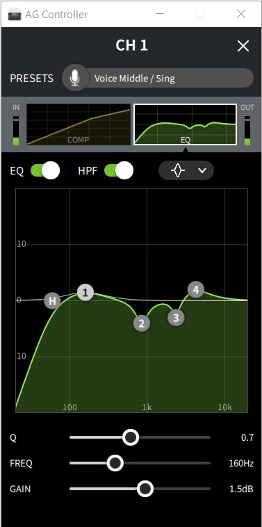 AG Controller es una aplicación de software que te permite controlar las funciones DSP de los AG03MK2, AG06MK2, AG03, AG06 y AG01 desde tu dispositivo Windows/Mac/iOS a través de una conexión USB