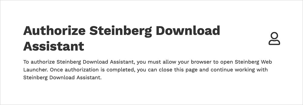 Verás una pantalla de autenticación solicitando permiso para abrir Steinberg Download Assistant en tu navegador. Una vez que apruebes esta solicitud, podrás utilizar Steinberg Download Assistant.