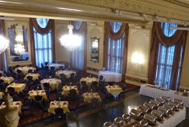 The landmark building recently upgraded its audio-visual system in the Missouri Room, its main ballroom, used for banquets and receptions. The room can accommodate up to 550 people. TSI-Global (St. Charles, MO) was responsible for the design and installation. “The ceiling and walls are decorated with ornate plaster relief carvings, states Steve Keller, Senior Account Manager at TSI-Global, who personally designed the system. This, along with the age of the building, offered unique challenges of finding ways to mount large projection screens and loudspeakers while maintaining the look and feel of this classically elegant room.”