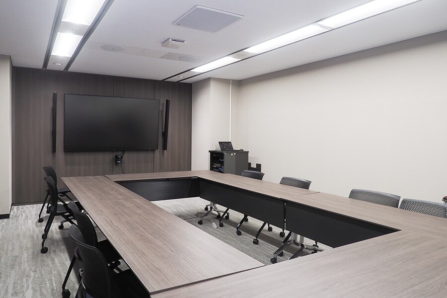 La sala de teleconferencias de la oficina de Takanawa de Yamaha con los sistemas ADECIA y ClickShare en funcionamiento