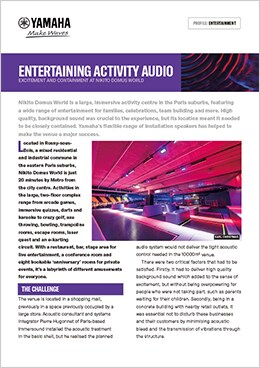 Nikito Domus World es un enorme centro de actividades inmersivas en los suburbios de París, que ofrece una amplia gama de entretenimiento para familias, celebraciones, actividades de integración de equipos y más. Un sonido de fondo de alta calidad era crucial para la experiencia, pero su ubicación exigía una contención acústica muy precisa. La flexible gama de altavoces de instalación de Yamaha ha sido clave para el gran éxito del lugar.