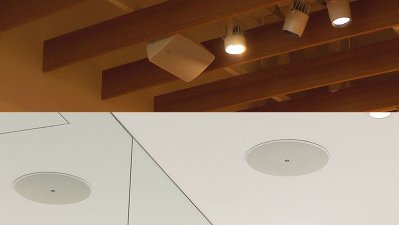 Dos tipos de altavoces, altavoces de techo y altavoces de montaje en superficie, que se montan en la pared o el techo, se utilizan generalmente para aprovechar con efectividad espacios como las tiendas y otros espacios comerciales o espacios de servicio. Es difícil instalar altavoces residenciales de una manera que satisfaga los requisitos comerciales. En general, los altavoces de techo se usan para hacer que la presencia de altavoces sea menos notable, y los altavoces de montaje en superficie se usan para sitios sin paneles de techo o para hacer que los altavoces sean una parte más prominente del diseño interior. Para tiendas con techos bajos, recomendamos usar altavoces de montaje en superficie, que son más fáciles de apuntar a áreas específicas destinadas a brindar sonido. Para tiendas con techos altos, los altavoces de tipo colgante, que se cuelgan del techo, también pueden ser adecuados. Al seleccionar altavoces, considere también las restricciones del sitio de instalación, por ejemplo, y los modelos que satisfagan sus propias preferencias de diseño o requisitos de construcción.