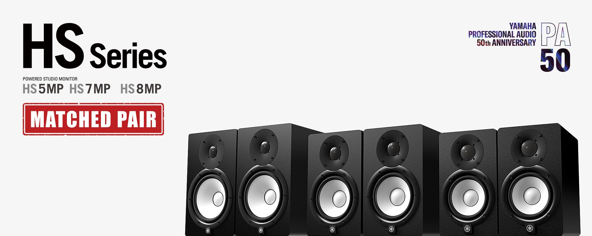 En 2019 celebramos el 50 aniversario de la división de Audio Profesional y teníamos la idea de producir un modelo especial de la serie HS que brindara aún más atención por parte de los ingenieros de Yamaha. La serie HS personifica la filosofía de diseño en la que Yamaha ha insistido por mucho tiempo al crear monitores de estudio, y ahora está disponible como un modelo de pares especial que utiliza piezas de volumen especiales. La serie del modelo de pares lleva la denominación MP (Matched Pair), y la etiqueta MP va pegada en la parte trasera de cada unidad. Fabricados al mismo tiempo, y con números de serie en par, Yamaha está ofreciendo los modelos “HS MP” como el modelo conmemorativo especial de su 50 aniversario. Confiamos que este par de altavoces especial de monitores estéreo cumplirá un rol valioso en tus grabaciones, mezclas y masterización.