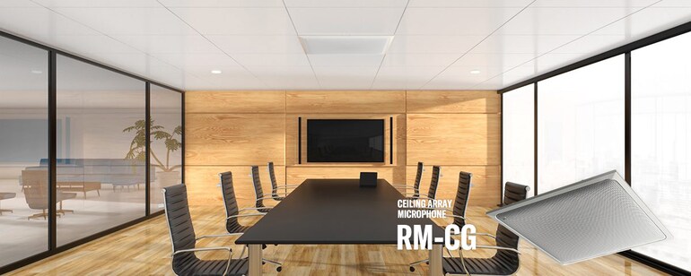 El RM-CG es un micrófono de techo equipado con cuatro haces de seguimiento automático capaces de rastrear simultáneamente la voz de varios hablantes. Dado que estos haces detectan y siguen la dirección de la fuente de sonido simplemente por la voz del hablante, no es necesario ajustar la posición o el rango de captación de sonido con antelación.