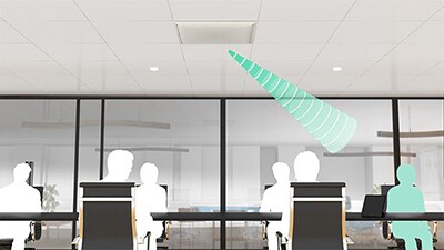 Con Voice Lift las personas en la misma sala se escuchan claramente desde cualquier parte, y un sistema voice lift con un micrófono array en el techo, un procesador, un amplificador de potencia y altavoces en el techo, crea un entorno cómodo para reuniones y seminarios en salas de conferencias grandes, auditorios escolares y otros entornos.