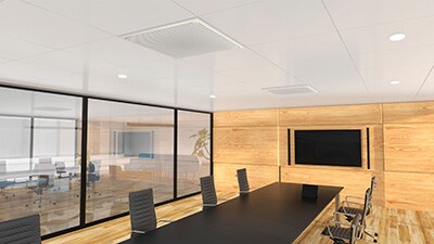 En las salas de conferencias de tamaño mediano con capacidad para entre 10 y 20 personas, la cobertura se puede ampliar conectando dos micrófonos de techo.