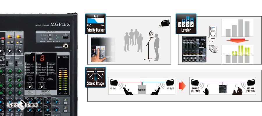 Las consola de mezcla de la serie MGP ofrecen dos procesadores de efectos distintos para estudio con el propósito de mejorar significativamente el sonido mediante un sistema de control intuitivo. La reverb de primer nivel REV-X de Yamaha ofrece tres efectos de reverb de alta resolución muy naturales y musicales: Hall, Room y Plate, imprescindibles en cualquier mesa de mezclas analógica de Yamaha. Para aumentar las posibilidades de modelar el sonido, el prestigioso procesador multiefectos digital SPX ofrece una amplia selección de 16 efectos digitales avanzados con parámetros editables. Ambos procesadores pueden usarse simultáneamente, proporcionando una gran variedad de herramientas para ampliar la paleta sonora.