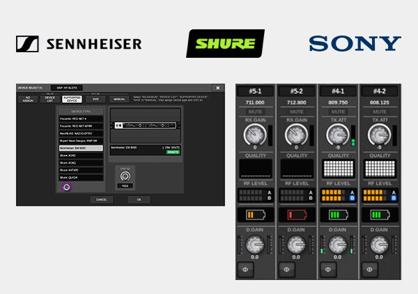Con el firmware V5.0 o posterior, las consolas RIVAGE PM admiten el control y la supervisión de los receptores inalámbricos más populares del mercado, lo que le brinda aún más libertad al operar sistemas de sonido construidos alrededor de un producto de la serie RIVAGE PM.