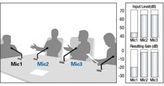 Si dos personas hablan simultáneamente, se ajusta la distribución de ganancia entre los micrófonos que están activos para conseguir una ganancia general consistente y constante, mientras que se disminuye la ganancia de los demás micrófonos.
