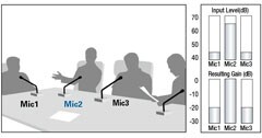 Cuando una persona está hablando, la ganancia del micrófono de dicha persona aumenta instantáneamente a 0 dB, mientras que la ganancia de los demás micrófonos disminuye. Lo mismo ocurre cuando habla cualquier otra persona.
