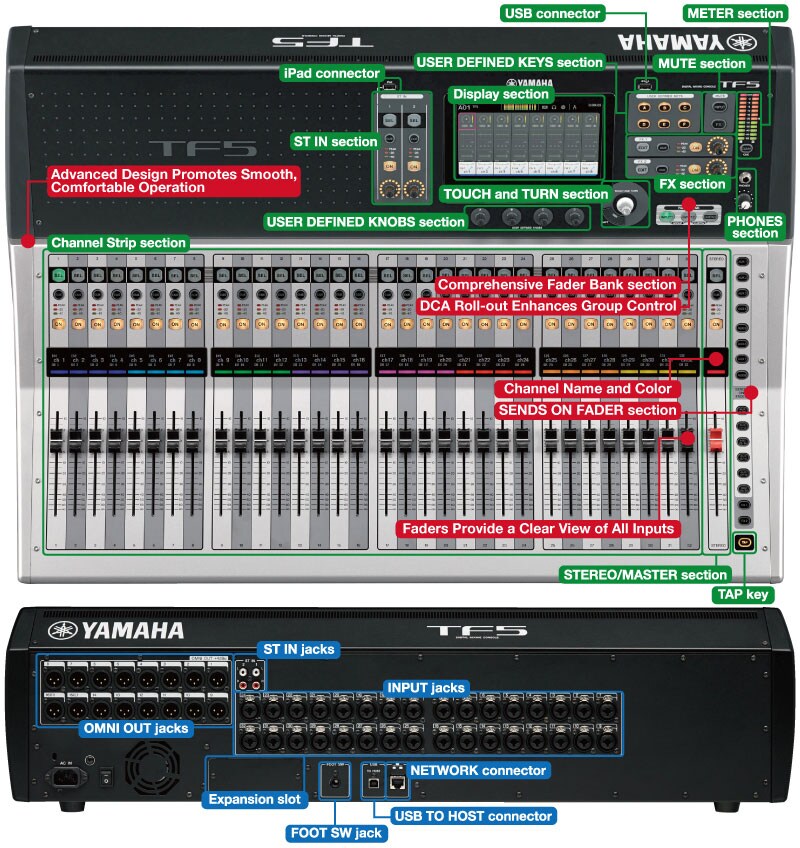La TF5 tiene 33 faders motorizados, la TF3 tiene 25 y la TF1 tiene 17. Todas las entradas del panel posterior tienen faders individuales, de modo que se puede verificar su estatus en un golpe de vista y se puede acceder a ellos directa e inmediatamente para su control.