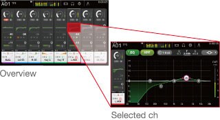 Al igual que la serie CL, la operatividad se basa en las ventanas de Visión General y Canal Seleccionado. La pantalla de Visión General muestra los parámetros de ocho canales a la vez, mientras que el botón de «tocar y girar» proporciona acceso directo a la ganancia, a la ecualización de control único (1-knob EQ™), a la compresión de control único (1-knob COMP™), al umbral de puerta, al nivel del envío a efectos, a la panoramización y a otros parámetros. Y si hace falta acceder a parámetros detallados para un control más preciso, tocando por segunda vez el parámetro resaltado se cambia a la pantalla de Canal Seleccionado.