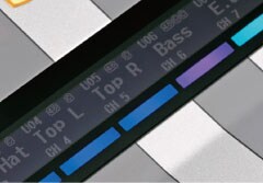 Un panel de visualización situado encima del fader de cada canal muestra el nombre o ID asignado a cada canal, el nombre del puerto y el ajuste del fader en ese momento. También puede visualizarse el estado de la alimentación phantom y del funcionamiento de la puerta y del compresor. Una barra de color que muestra el color asignado al canal hace que la navegación visual sea facilísima y evita la confusión cuando se cambian los bancos de faders o se recuperan escenas.