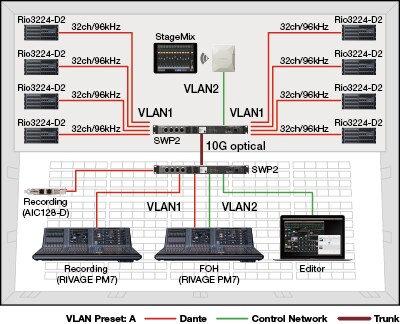 En este caso, se utiliza el Preset A de VLAN, donde VLAN1 maneja la red Dante mientras que VLAN2 aloja señales de control, como el Editor o StageMix de las señales de audio de Dante, lo que hace que la red sea más estable.
