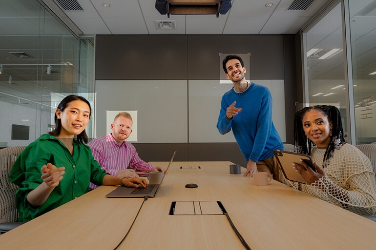 La función encuadre inteligente reconoce a las personas que hablan en la sala y encuadra automáticamente la señal de video de los participantes remotos.
