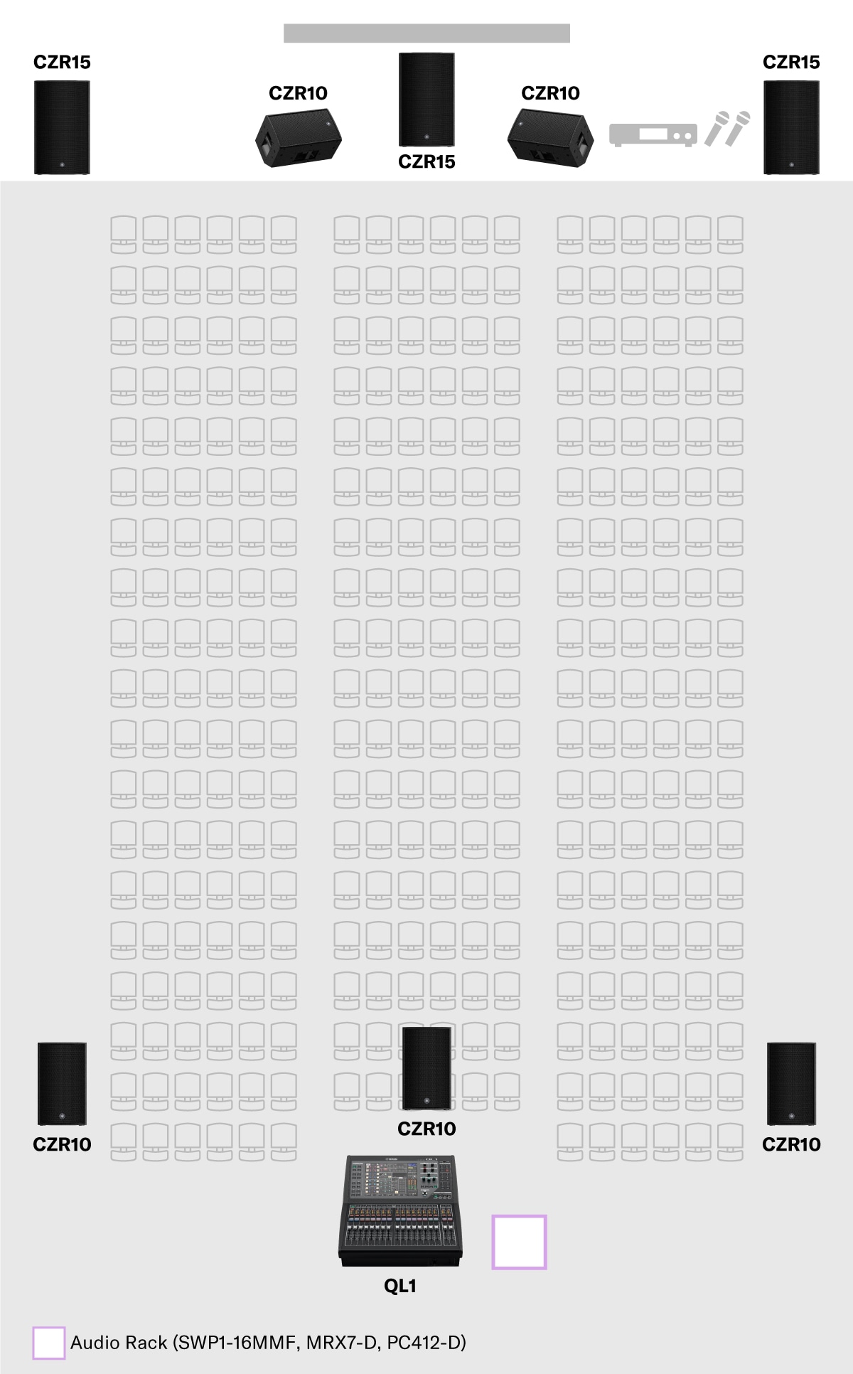 • La construcción de un sistema centrado en un mezclador compatible con Dante también permite un soporte flexible para lugares como un auditorio. La serie CZR ofrece alta calidad de sonido y una salida potente, y permite la rotación de la bocina para una cobertura óptima, ya sea que se instale vertical u horizontalmente. Los amplificadores de potencia de la serie PC-D vienen equipados con ajustes preestablecidos de la serie CZR para una fácil configuración de los ajustes DSP ideales.