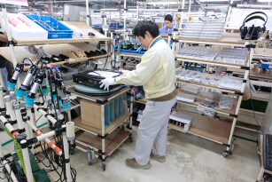 Yamaha employs a cell-production system at the Toyooka factory for final assembly rather than the more traditional assembly line approach. Assembly and basic inspection for each product takes place entirely with a single "cell," which is manned by anywhere from one to about ten workers, depending on the complexity of the product. This approach offers a number of advantages. Once a traditional assembly line is set up it is very difficult to modify, and it will occupy the same amount of factory space regardless of the production volume. Production cells, on the other hand, can be dynamically adjusted and rearranged to meet production needs. Production can be interrupted at any time to allow improvements in the process, such as the implementation of different tools or jigs. In many cases the cell workers design and construct their own jigs to suit the task at hand. In fact, cell workers at Yamaha factories are true specialists in the sense that they have extensive knowledge of the product they are working on, and take responsibility and pride in a large portion of its production. When assembly is complete, each and every unit produced undergoes a thorough final inspection right in the cell, so if a problem is detected it can be rectified immediately and effectively.