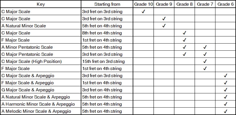 El alumno tocará de memoria, sin el uso de partitura, una escala para Grados 10 y 9 y dos escalas para Grados 8 al 6, todas seleccionadas por el examinador.