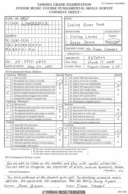 An examiner certified by Yamaha Corporation and Yamaha Music Foundation and the class teacher will conduct the examination and report the following information about the student.