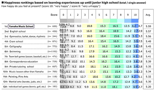 Profesor Maeno: Sí, cuando examinamos las clasificaciones de felicidad basadas en las experiencias de aprendizaje hasta la escuela secundaria, los que asistieron a la Academia de Música Yamaha ocuparon el primer lugar.* Yo también asistí a la Academia de Música Yamaha cuando era niño, y me sorprendieron gratamente estos resultados.