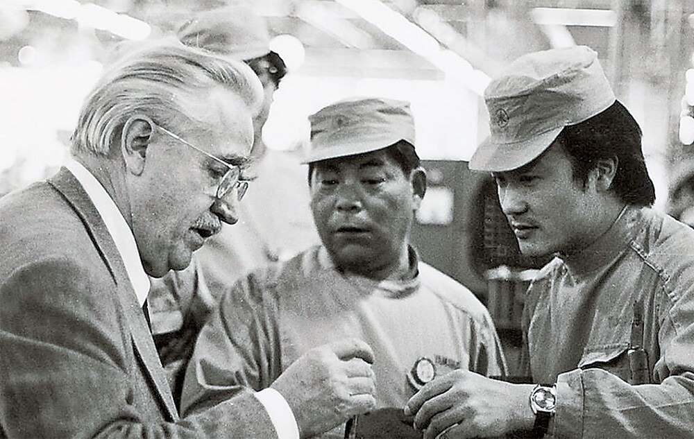 Schilke realiza controles de calidad en la fábrica de Toyooka, mientras Kawasaki (derecha) observa (1970)