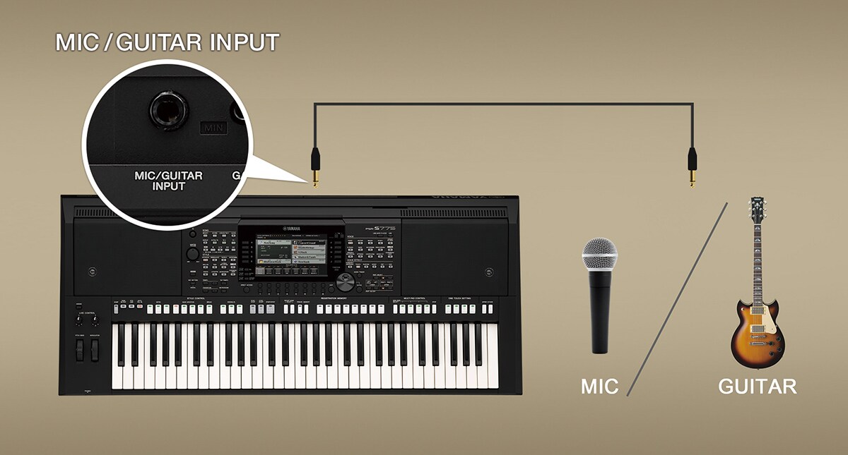 The PSR-S775 comes equipped with a Mic/Guitar input that allows you to add vocals or guitar to your live performance with ease. Simply plug in a microphone and you can effortlessly assign any of the PSR's versatile effects to the vocals. Or, connect a guitar and adjust the parameters to suit your preference and emulate the sound of your favorite artists or create a sound that's all your own!