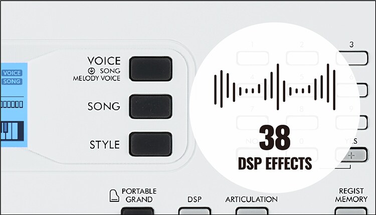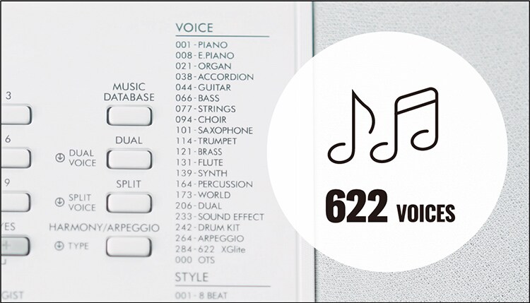 El EZ-300 tiene un total de 622 sonidos de instrumentos integrados (llamados Voices) Incluye sonidos (voices) especiales "en vivo", que son muestreos grabados de un piano de cola, cuerdas y bronces. Con solo este teclado puedes tocar una gran variedad de instrumentos musical reales y ejecutar con un sonido asombrosamente completo. Además, tiene la función Touch Response que te permite controlar el volumen de forma expresiva según la fuerza o la suavidad con la que presionas las teclas. Te permite familiarizarte con la música y expresarte, y al mismo tiempo divertirte con las funciones de auto acompañamiento y varios efectos.