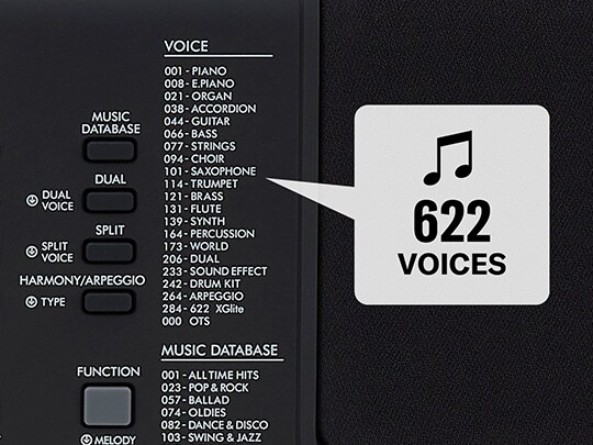 The PSR-EW310 features a newly developed tone generator LSI that delivers stunning improvements in sound quality as well as high-quality effects. Thanks to this new LSI, you can enjoy a comprehensive library of 622 instrument Voices perfect for playing in any genre you choose, as well as unique Super Articulation Lite Voices that reproduce the trills and string noise of stringed instruments such as the cello and mandolin—previously difficult to emulate—with amazing realism, for superbly authentic performances.