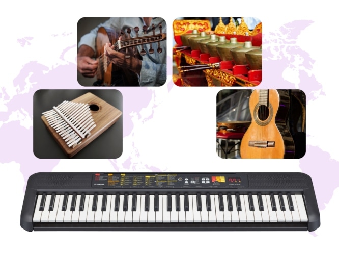 No solo los pianos, guitarras o instrumentos de viento, el Yamaha PSR-F52 está equipado con los sonidos de instrumentos (Voices) que son esenciales para interpretar la música de muchas regiones diferentes. La función de acompañamiento automático (Style) ofrece la diversión de tocar con una banda virtual y presenta una variedad de estilos no solo de géneros estándar como el rock o el jazz, sino también aquellos que capturan la esencia de música amada en muchos países diferentes.