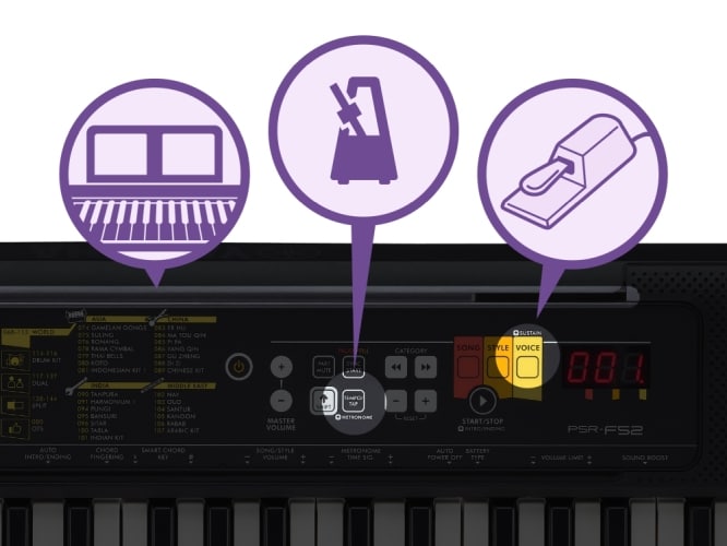 El PSR-F52 incluye un atril, así como funciones que reemplazan los objetos físicos necesarios para comenzar a tocar el teclado, como la función Sustain que actúa como un pedal de sostenido para una caída más prolongada y un metrónomo incorporado para desarrollar un sentido de ritmo. El Song Book descargable gratis y más, el PSR-F52 proporciona las ayudas para principiantes.