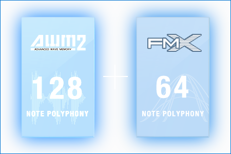El motor AWM2, que solo se encuentra en el sintetizador de música Yamaha, ofrece mucho más que reproducción de muestreo. Cada parte de los 16 AWM2 ofrece ocho sintetizadores completamente programables con un filtro (18 tipos diferentes) de amplitud, tono y generador de filtro de envelope, nueve LFOs, 3 bandas de EQ y un efecto dedicado de doble inserción con el modelado de circuitos virtuales.