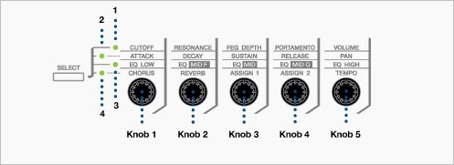 MOTIF-RACK XS encierra un enorme poder creativo y no hay un modo más sencillo de acceder a ese poder que mediante el uso de los cinco botones de control. Estos botones permiten manipular el sonido del instrumento en tiempo real, evitando los inconvenientes que supone ir de una pantalla a otra para encontrar los parámetros que se desea cambiar. ¿Necesitas ajustar el nivel de reverb para la voz seleccionada? Pulsa el botón SELECT para visualizar la cuarta fila de parámetros, luego pulsa el botón 2. ¿Deseas cambiar rápidamente el timbre de una voz como, por ejemplo, reducir un poco los agudos de un sonido de piano? Sitúate en la tercera fila y ajusta las distintas bandas de ecualización, utilizando el botón 5 correspondiente a las frecuencias agudas. También puedes potenciar los graves de una voz utilizando el botón 1. Si deseas ajustar el volumen de la voz seleccionada, dirígete a la primera fila y gira el botón 5. Puedes asignar ajustes a dos botones, lo que te permite elegir tus parámetros favoritos para efectuar un control personalizado.