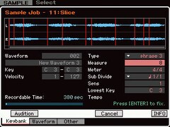 Con el secuenciador de muestras incorporado puedes integrar datos de audio (muestras) y datos MIDI sin problema alguno. El sistema soporta la carga de archivos WAV/AIFF. Puedes usar la función de corte temporal (time slice) para recortar sonidos muestreados y controlarlos de la misma manera que harías con los datos MIDI. Por ejemplo, puedes sincronizar a un mismo BPM los datos de audio con los datos de secuencia MIDI. Además, si preconfiguras el tempo, la armadura de clave, el número necesario de compases y el número de pulsos, podrás recortar fácilmente las distintas partes y crear loops de audio perfectos. También puedes usar los distintos comandos de edición para modificar tus muestras. El MOTIF XF suporta funciones tales como el estiramiento del tiempo, que permite cambiar la longitud de la muestra mientras la altura permanece idéntica; cambiar la altura de las notas mientras la longitud de la muestra se mantiene igual, o bien la remezcla de loops, que permite crear al instante variaciones musicales de loops de grooves. Adicionalmente, cuentas con una función de remuestreo que te permite grabar la interpretación del MOTIF XF como muestra de audio individual.