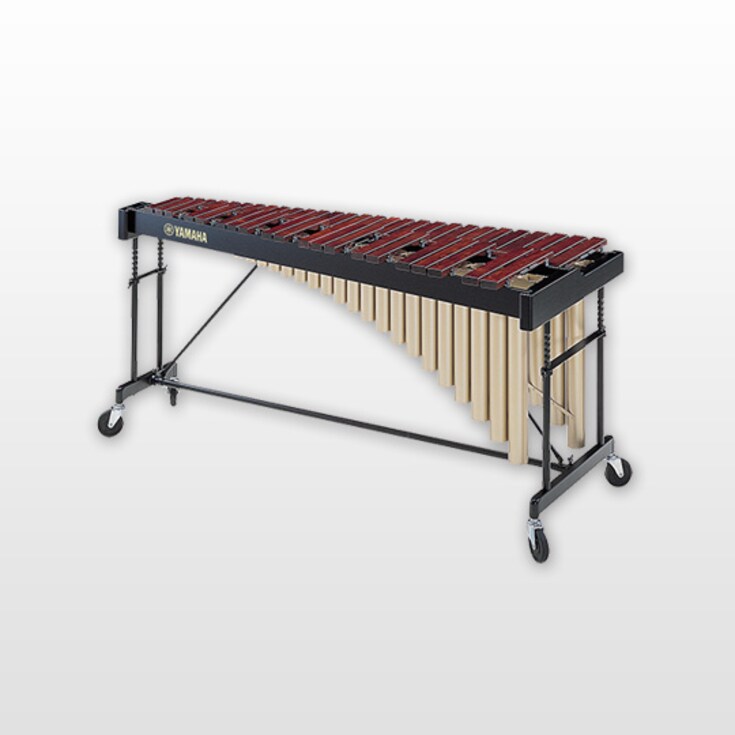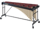 Marimba de cuatro octavas con barras de madera de palisandro, registro C28-C76, ranuras de resonador de tres posiciones, armazón de altura regulable, soportes con dos ángulos y refuerzos horizontales de las patas.
