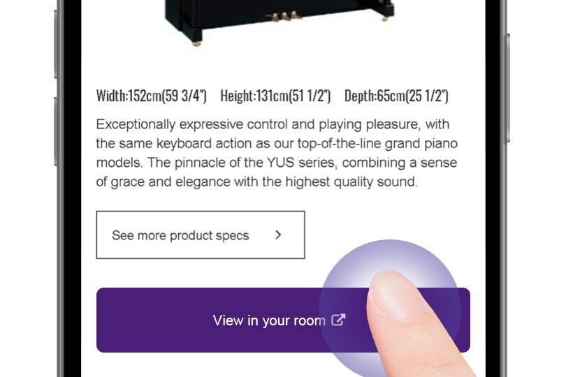 Solo selecciona el modelo de piano que quieres ver desde esta página en tu teléfono móvil o tableta, no necesitas una aplicación dedicada. Explora el modelo 3D detallado e incluso toma una foto de cómo se vería en tu habitación.